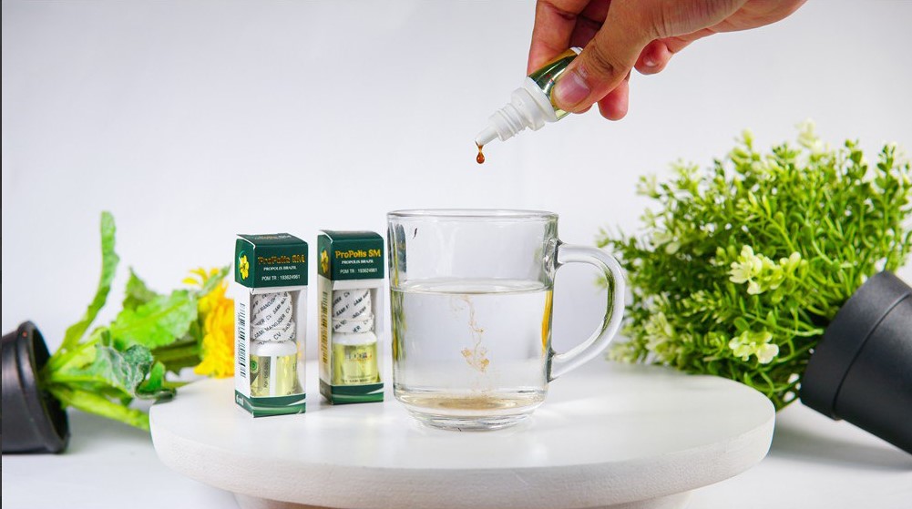 Teteskan 5–7 tetes Propolis SM ke dalam 1/4 gelas air hangat.